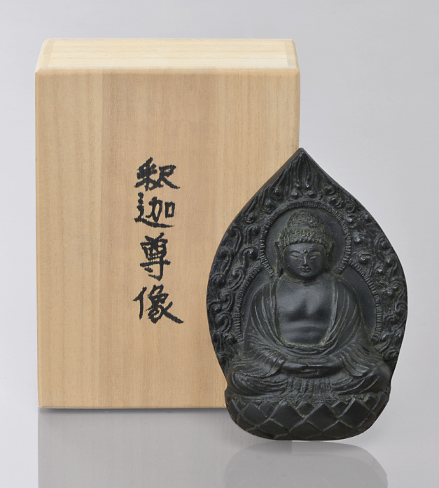 「釈迦尊像」 サイズ/高さ12×幅8×奥行1.3cm 材質/乾漆、その他 価格 100,000円(税込) 作品に落款、保証書添付 <見処> 仏師雲岫斎慧慶と現代彫刻家亀谷政代司が合わさって、優美な姿の釈迦尊像が完成しました。 乾漆の素材が成す、やわらかな表面がどんな救いでも受け止めてくれる。そんな趣と深みのある姿として完成いたしました。 <用途>手のひらサイズにこだわって、いつでも自分の身に伴うことができる守り仏また、秘仏として…。